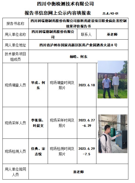四川科瑞德制藥股份有限公司原料藥建設項目職業病危害控制效果評價報告書