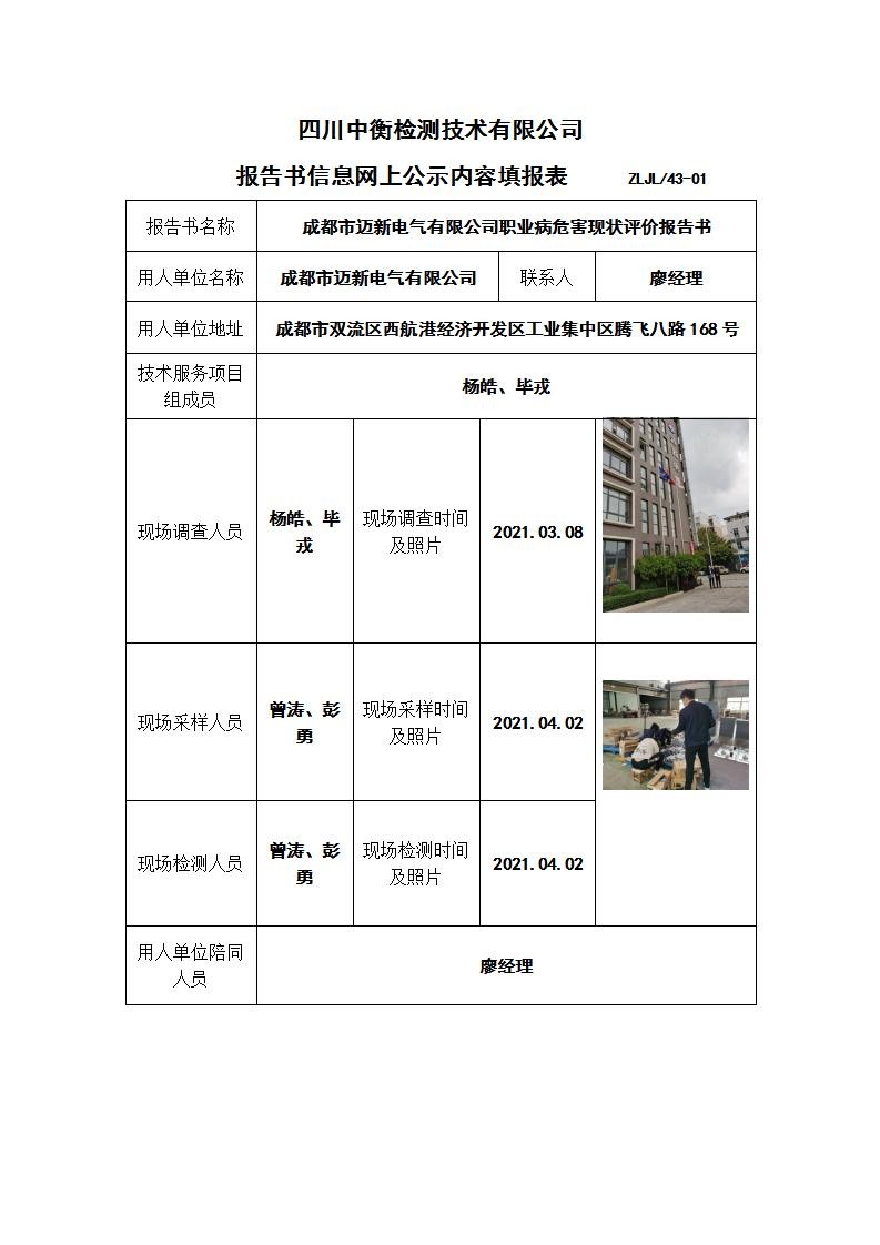 成都市邁新電氣有限公司職業(yè)病危害現(xiàn)狀評(píng)價(jià)