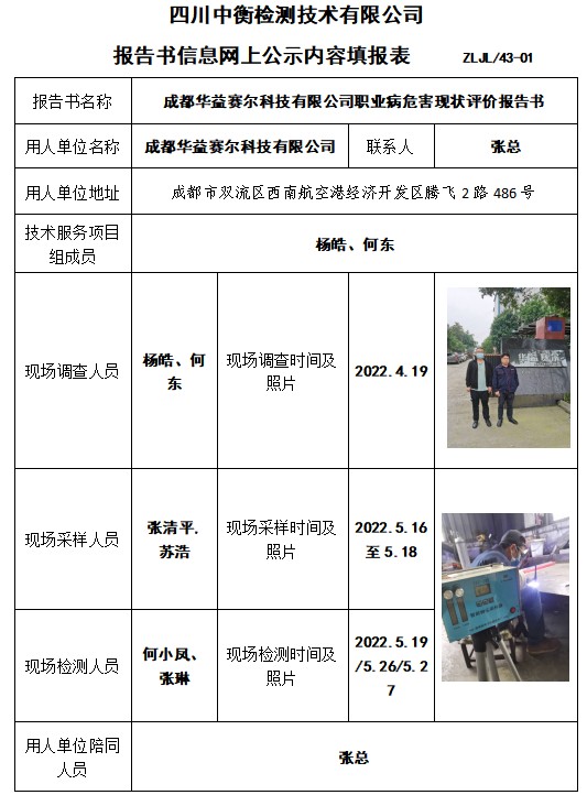 成都華益賽爾科技有限公司職業病危害現狀評價