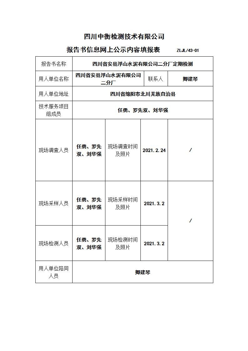 四川省安縣浮山水泥有限公司二分廠職業病危害定期檢測