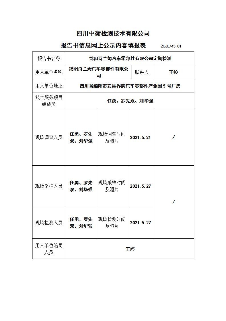 綿陽詩蘭姆汽車零部件有限公司職業病危害定期檢測
