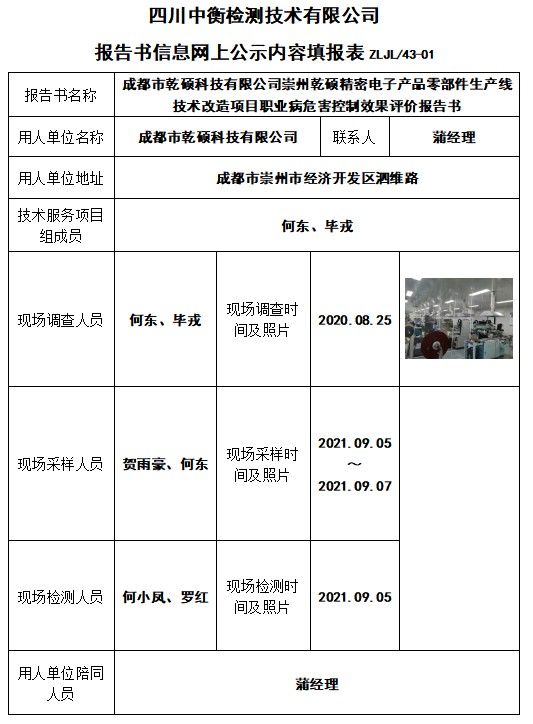 成都市乾碩科技有限公司崇州乾碩精密電子產品零部件生產線技術改造項目職業病危害控制效果評價