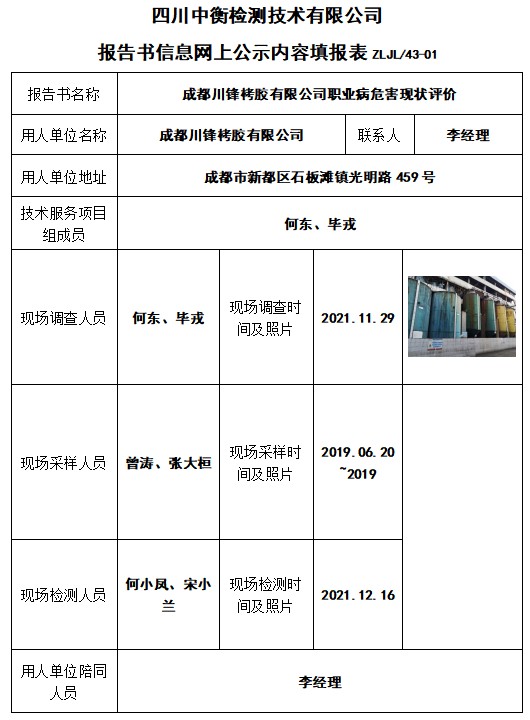 成都川鋒栲膠有限公司職業病危害現狀評價
