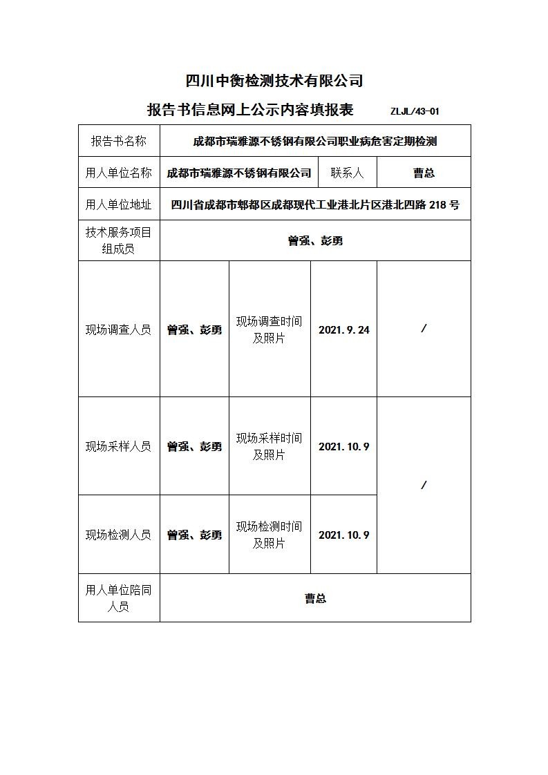 成都市瑞雅源不銹鋼有限公司職業病危害定期檢測