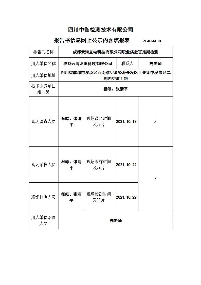 成都云海龍電科技有限公司職業(yè)病危害定期檢測