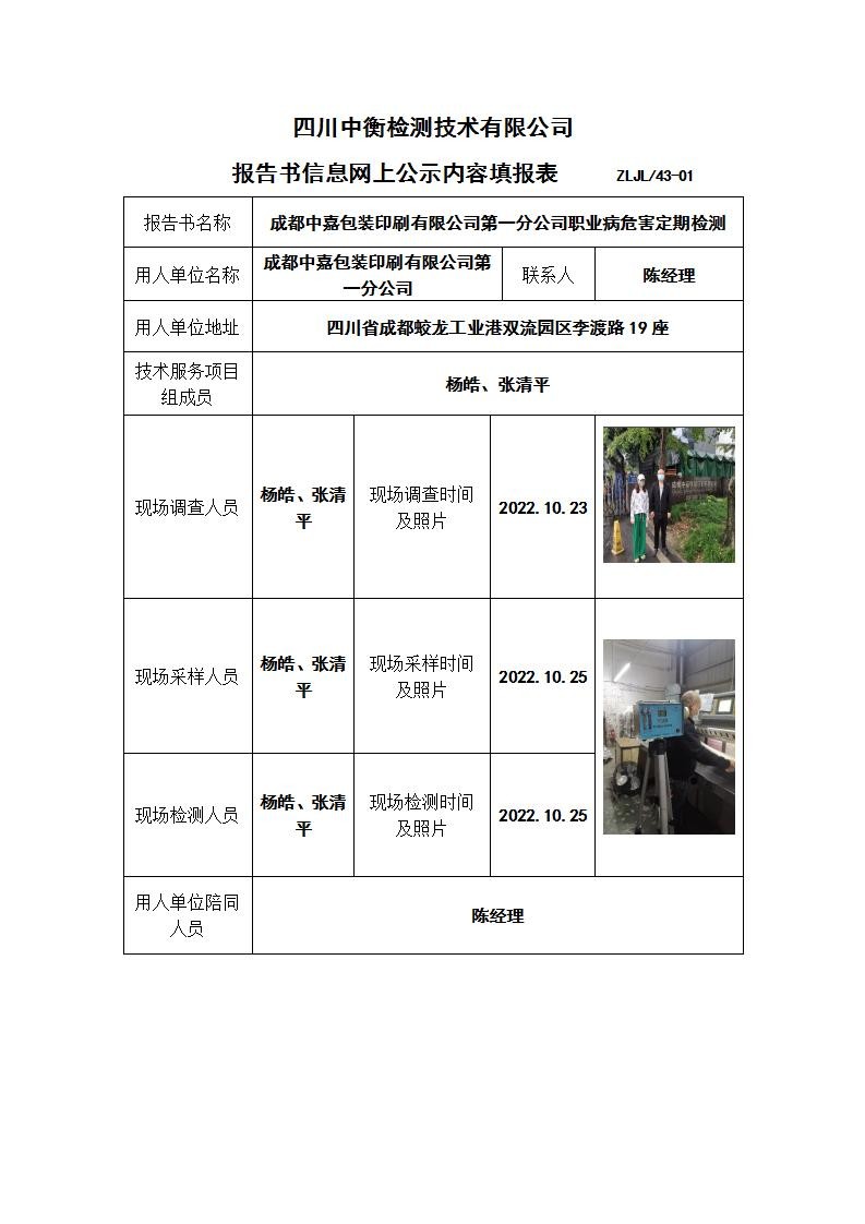 成都中嘉包裝印刷有限公司第一分公司職業病危害定期檢測