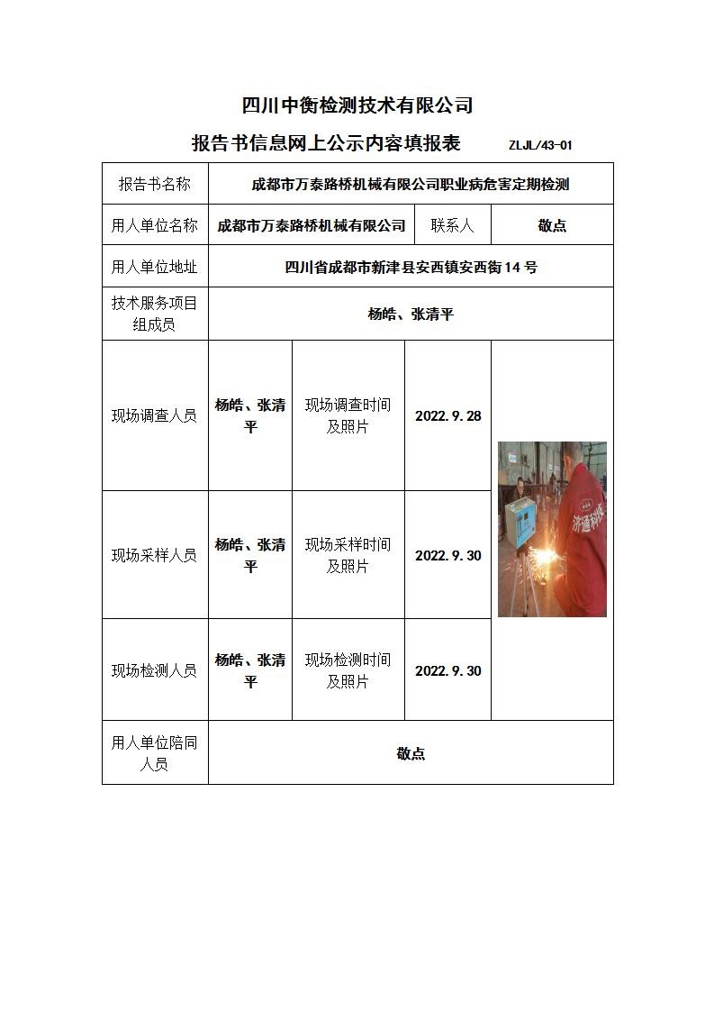 成都市萬泰路橋機械有限公司職業病危害定期檢測