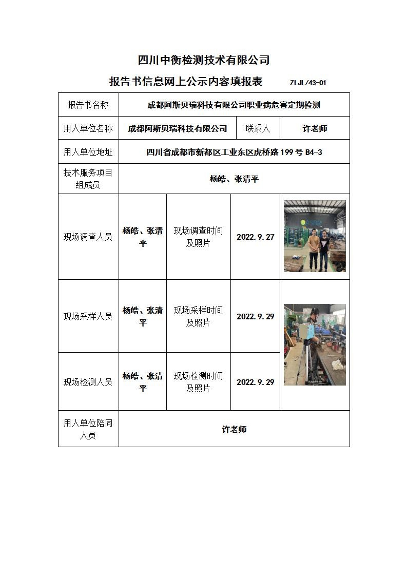 成都阿斯貝瑞科技有限公司職業(yè)病危害定期檢測