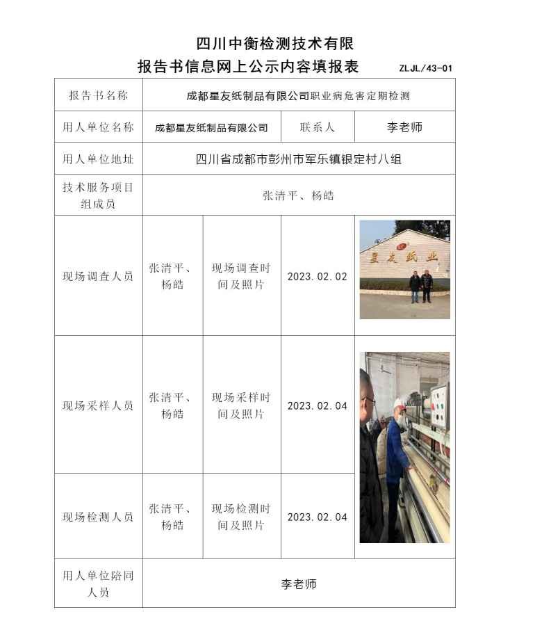 成都星友紙制品有限公司職業病危害定期檢測