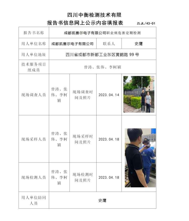 成都凱賽爾電子有限公司職業病危害定期檢測
