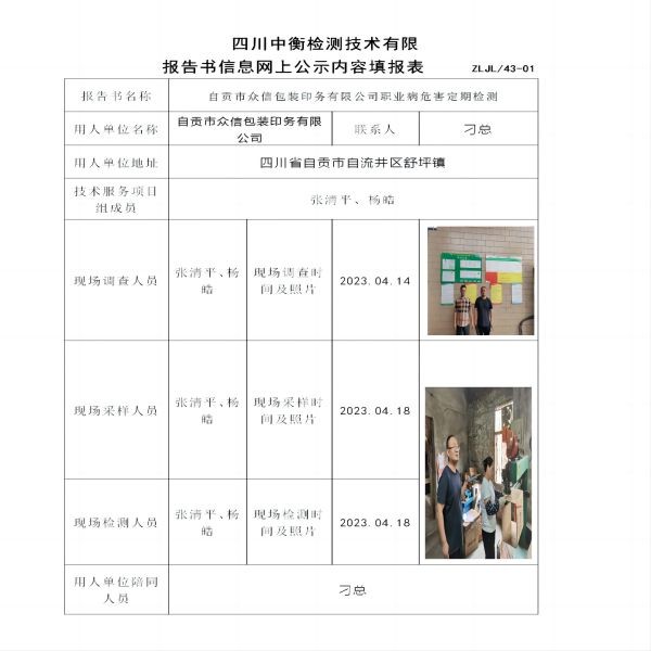 自貢市眾信包裝印務(wù)有限公司職業(yè)病危害定期檢測(cè)