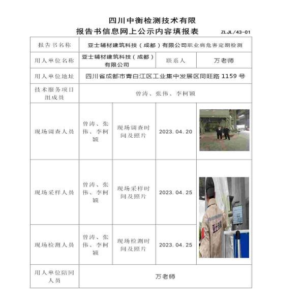 亞士輔材建筑科技(成都)有限公司職業病危害定期檢測