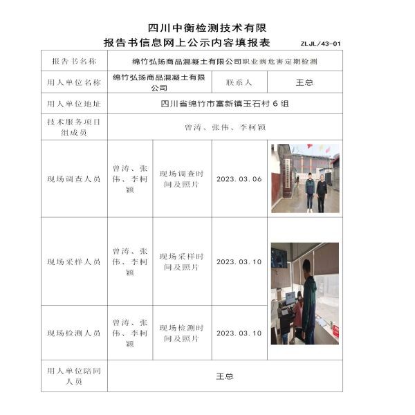 綿竹弘揚商品混凝土有限公司職業病危害定期檢測