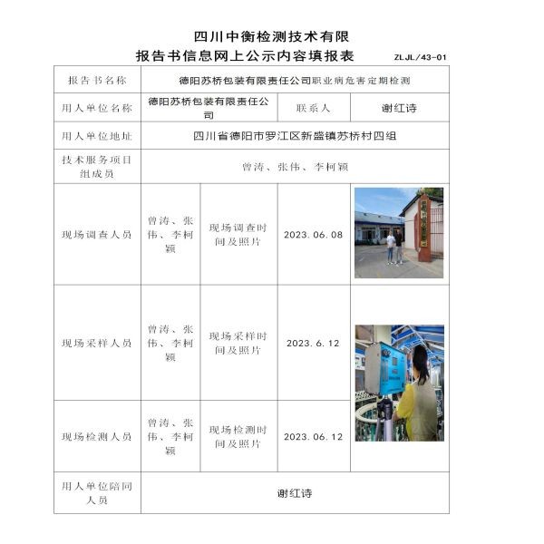 德陽蘇橋包裝有限責任公司職業(yè)病危害定期檢測