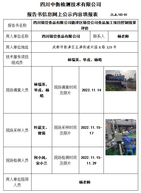 四川錦嘗食品有限公司新津區(qū)錦嘗公司食品加工項目控制效果評價