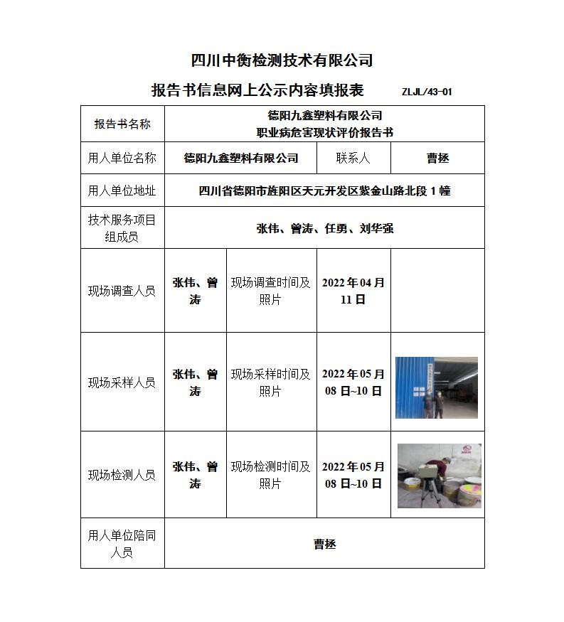 德陽九鑫塑料有限公司職業病危害現狀評價