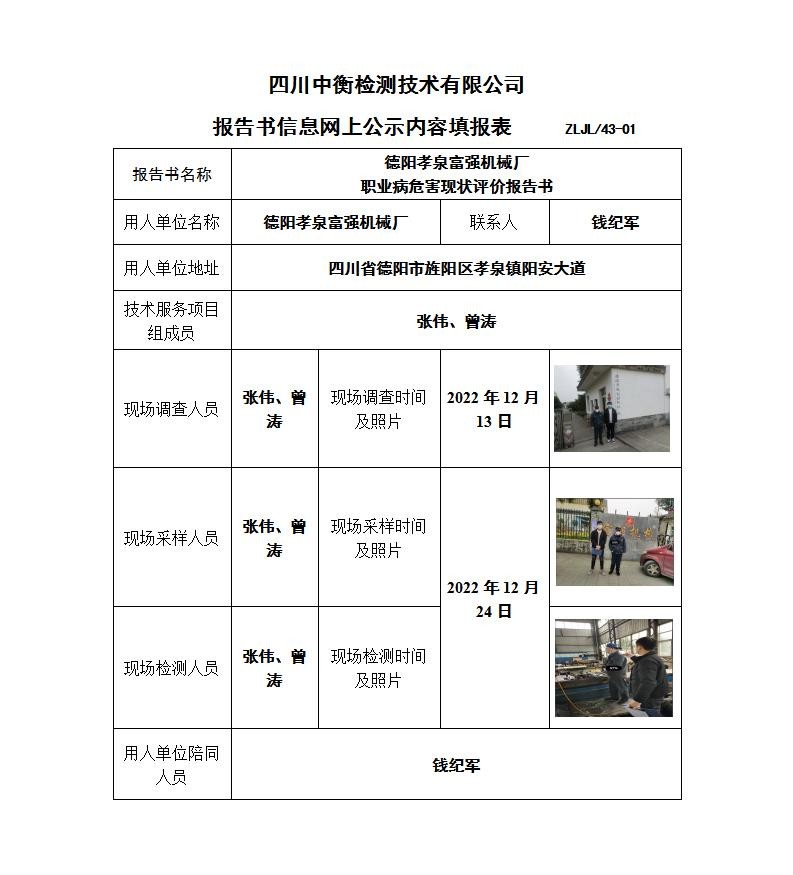 德陽孝泉富強機械廠 職業病危害現狀評價報告書