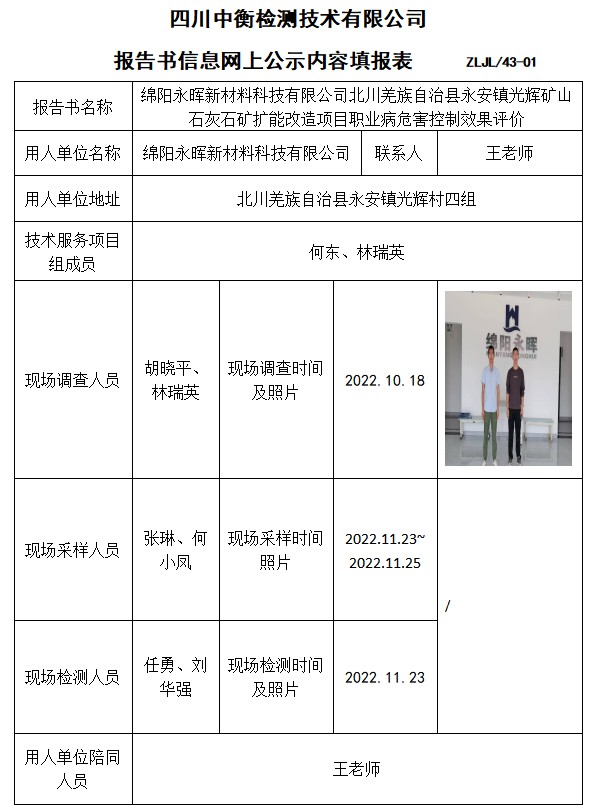 綿陽永暉新材料科技有限公司北川羌族自治縣永安鎮光輝礦山 石灰石礦擴能改造項目控制效果評價