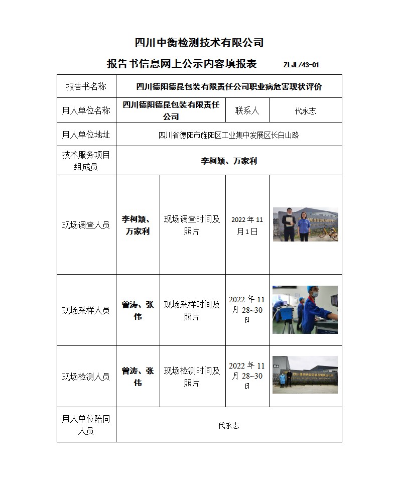四川德陽德昆包裝有限責任公司 職業病危害現狀評價報告書