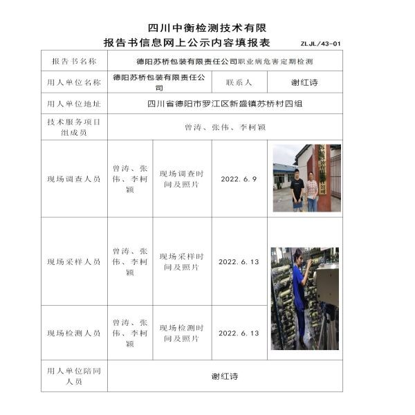 德陽(yáng)蘇橋包裝有限責(zé)任公司職業(yè)病危害定期檢測(cè)