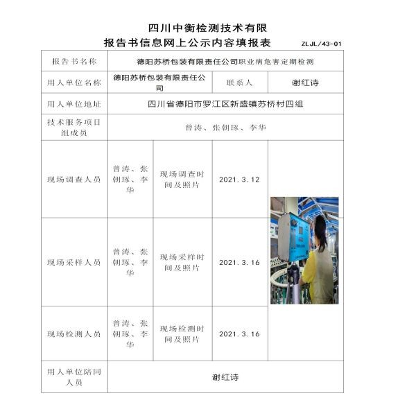 德陽蘇橋包裝有限責任公司職業病危害定期檢測