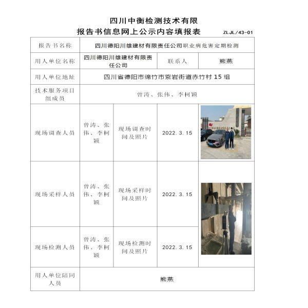 四川德陽川雄建材有限責任公司職業(yè)病危害定期檢測
