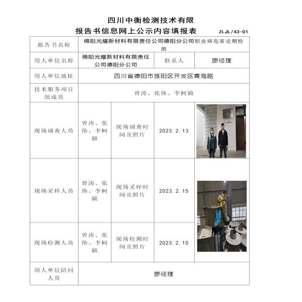 綿陽光耀新材料有限責任公司德陽分公司定期檢測