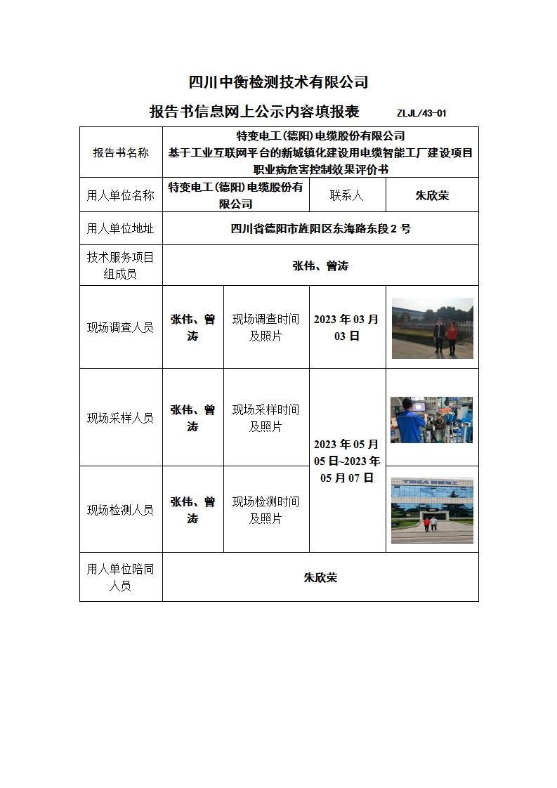 特變電工(德陽)電纜股份有限公司“基于工業(yè)互聯(lián)網(wǎng)平臺的新城鎮(zhèn)化建設(shè)用電纜智能工廠建設(shè)項目”職業(yè)病危害控制效果評價