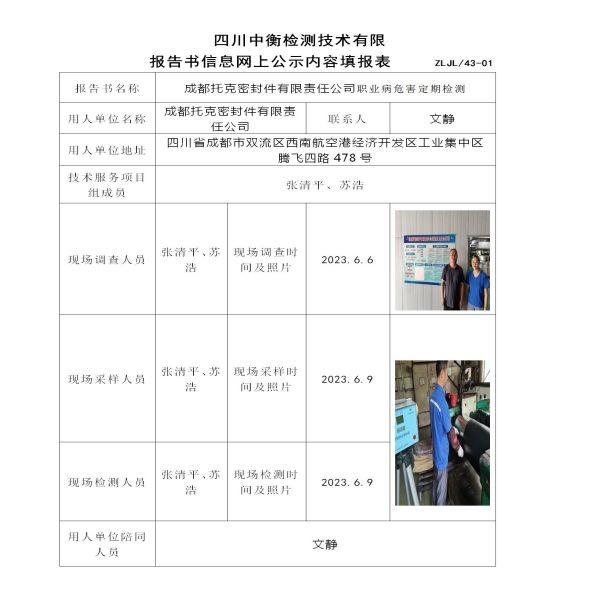 成都托克密封件有限責(zé)任公司職業(yè)病危害定期檢測(cè)