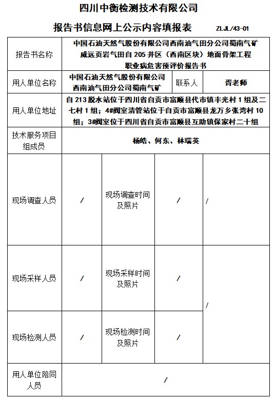 中國石油天然氣股份有限公司西南油氣田分公司蜀南氣礦 威遠(yuǎn)頁巖氣田自205井區(qū)(西南區(qū)塊)地面骨架工程 職業(yè)病危害預(yù)評價報告書