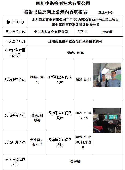 北川鑫宏礦業有限公司年產30萬噸石灰石開采及加工項目職業病危害控制效果評價報告書