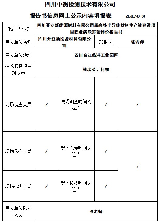 四川開立新能源材料有限公司超高純半導體材料生產線建設項目職業病危害預評價報告書