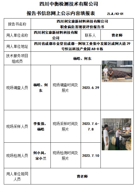 四川利寶康新材料科技有限公司 職業(yè)病危害現(xiàn)狀評(píng)價(jià)報(bào)告書(shū)