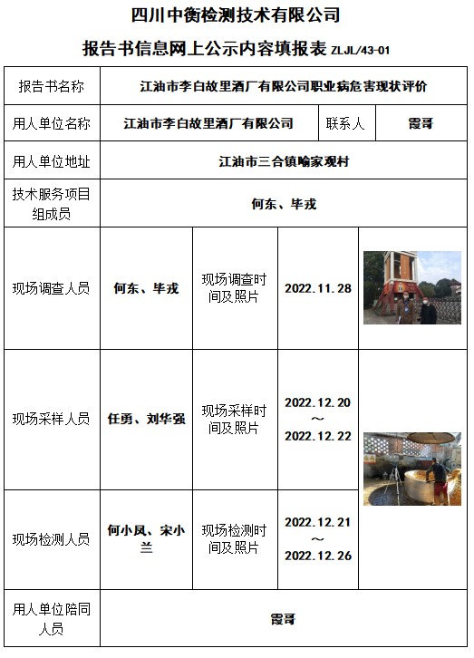 江油市李白故里酒廠有限公司職業(yè)病危害現(xiàn)狀評價