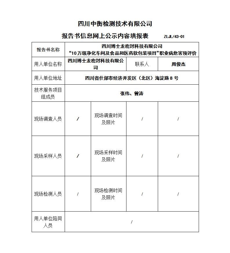 四川博士龍密封科技有限公司“10萬級(jí)凈化車間及食品和醫(yī)藥軟包裝項(xiàng)目” 職業(yè)病危害預(yù)評(píng)價(jià)