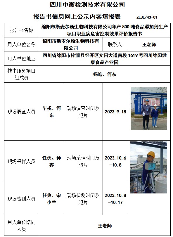 綿陽市斯麥爾顧生物科技有限公司年產800噸食品添加劑生產項目職業病危害控制效果評價報告書