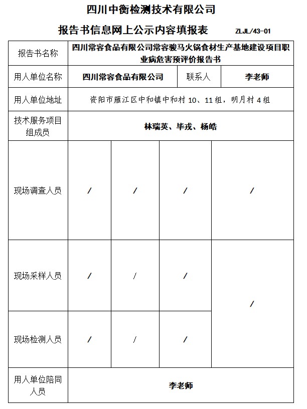 四川常容食品有限公司常容駿馬火鍋食材生產基地建設項目職業病危害預評價報告書