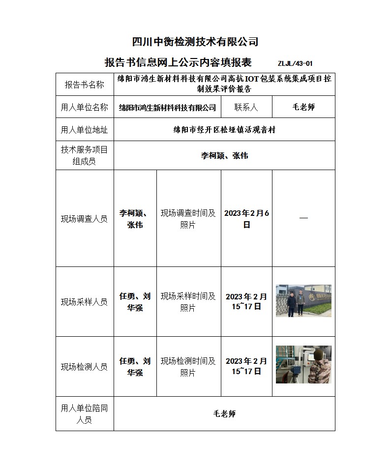 綿陽市鴻生新材料科技有限公司高抗IOT包裝系統集成項目控制效果評價報告