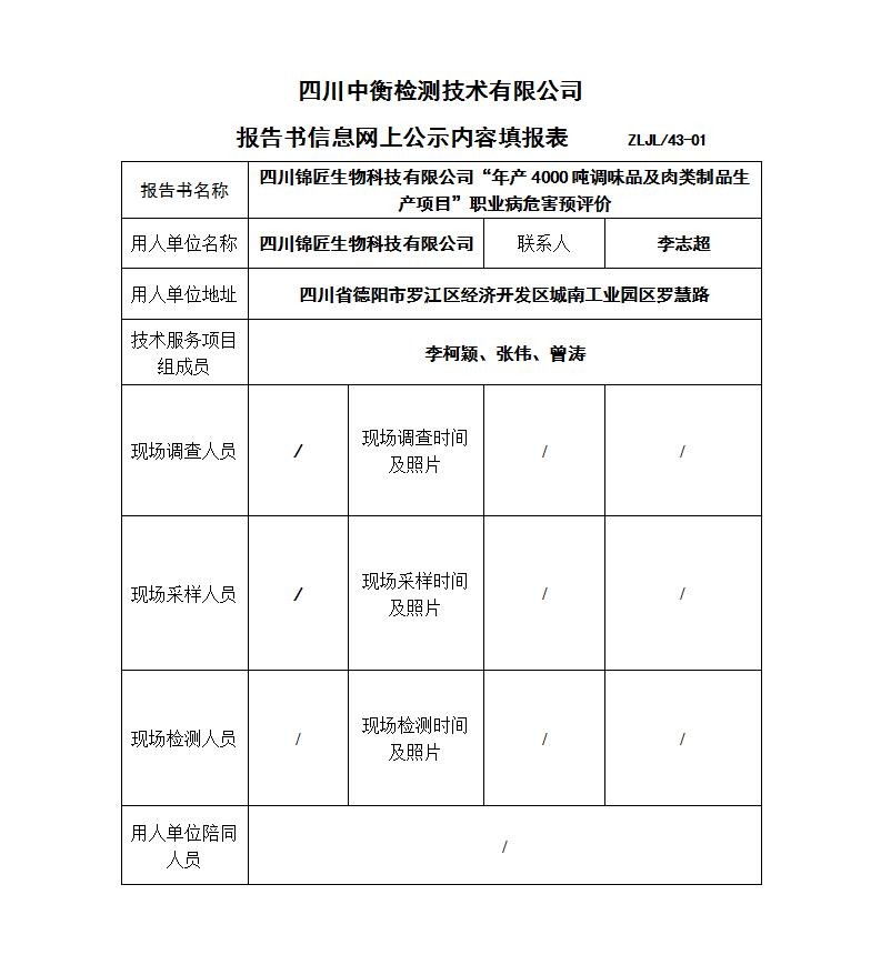 四川錦匠生物科技有限公司“年產4000噸調味品及肉類制品生產項目”職業病危害預評價