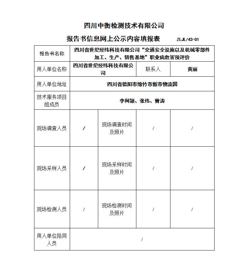四川省世紀經緯科技有限公司“交通安全設施以及機械零部件加工、生產、銷售基地”職業病危害預評價